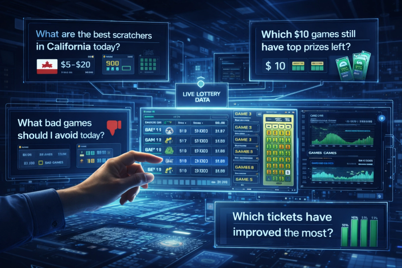 Live game lookup by state, price tier, and game name is the foundation. A player should be able to say "show me the best $10 games in Texas right now" and get a real answer from live data. Not a cached answer from last month. Not a generic ranking based on launch-day odds. What's actually available, evaluated against what's actually been claimed, calculated today.